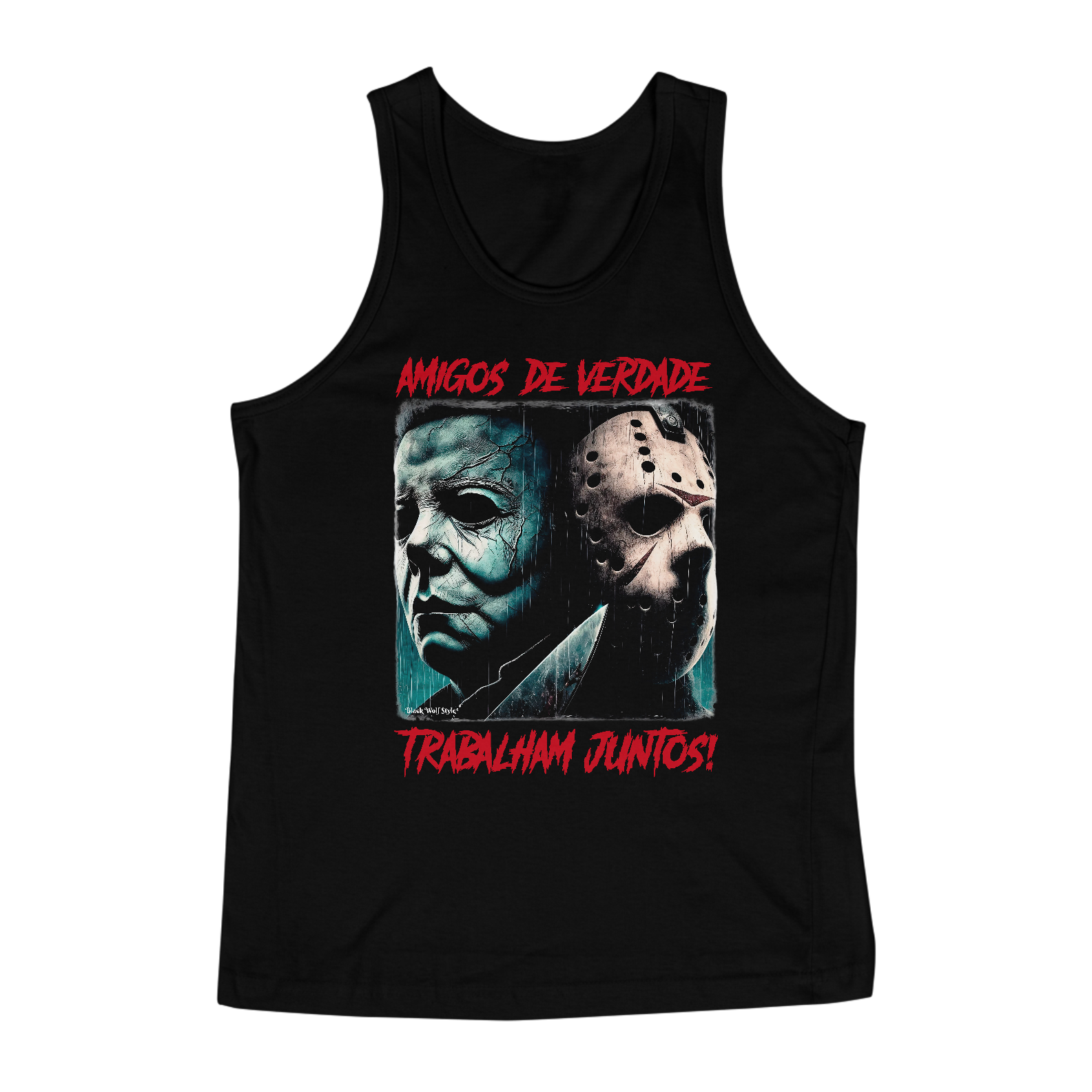 Estampa com texto humorado dos personagens Michael Myers (filme - Halloween) e Jason Voorhees (filme - Sexta-Feira 13)