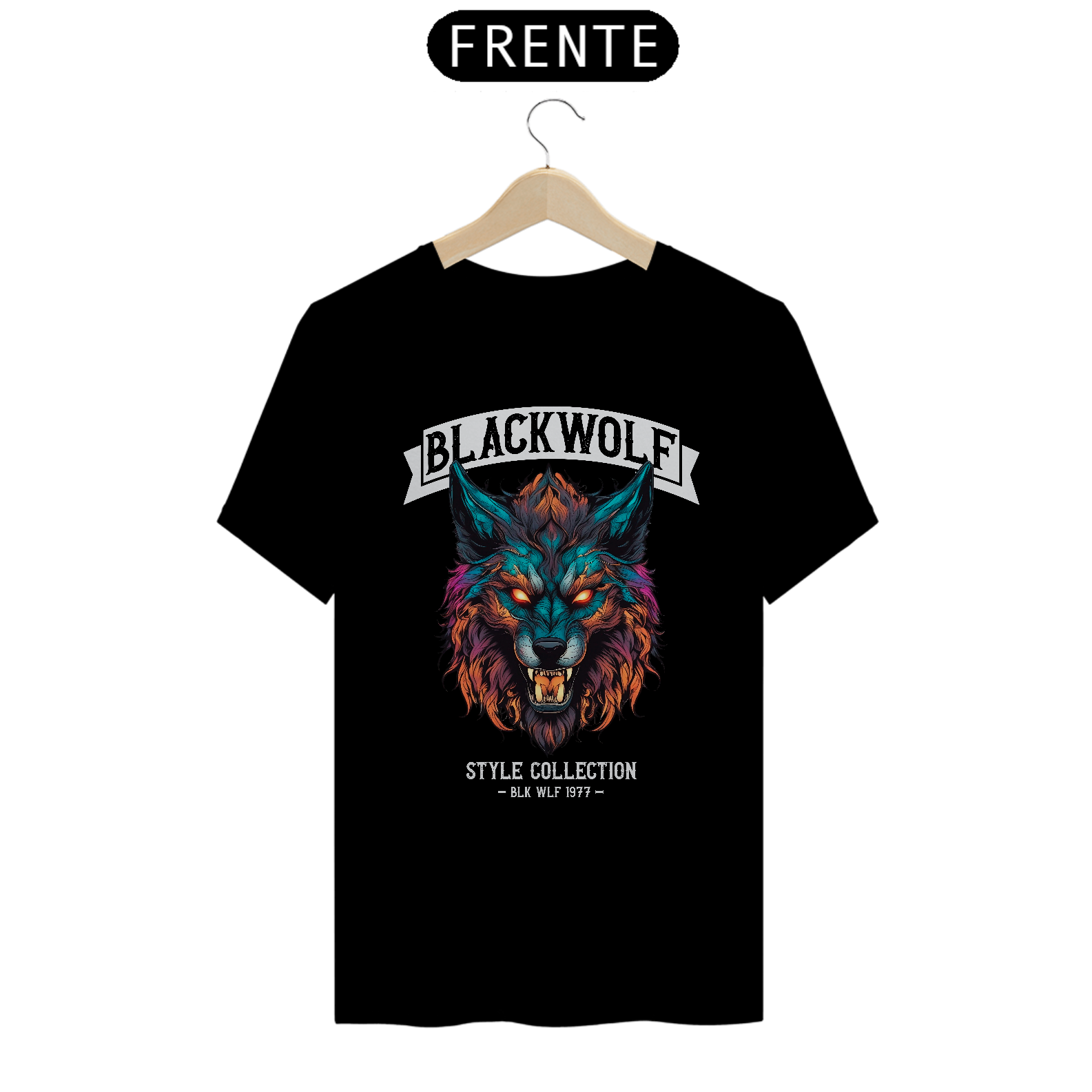 Estampa colorida da face de um Lobisomen com a nossa marca - Black Wolf - acima